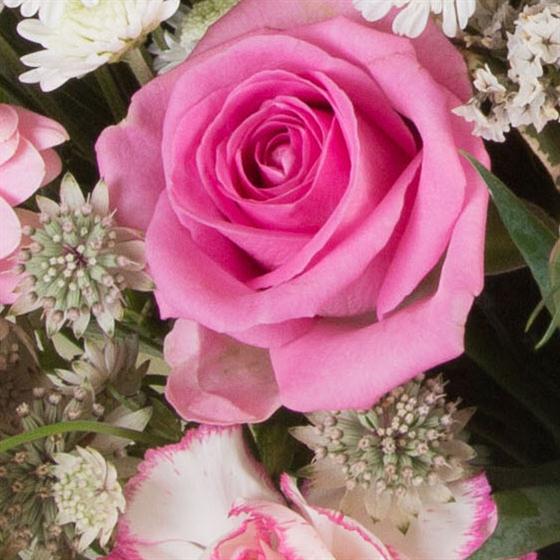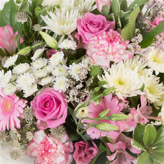 Our most popular bouquet, a collection of blooms in shades of pink and cream, hand-tied and finished with a complementary wrap.