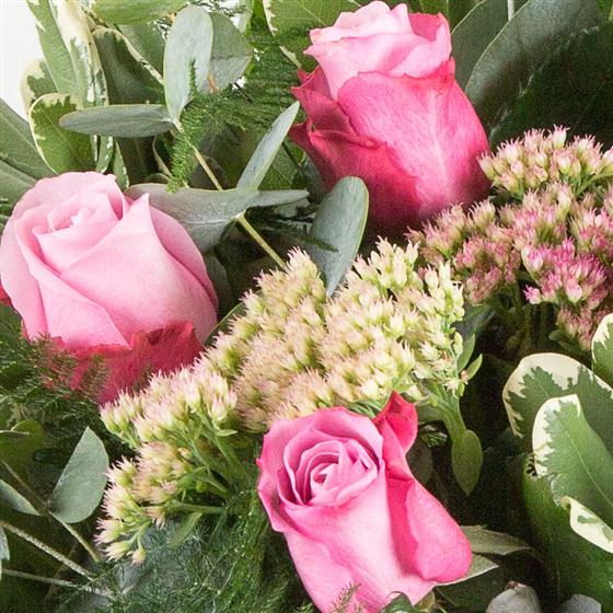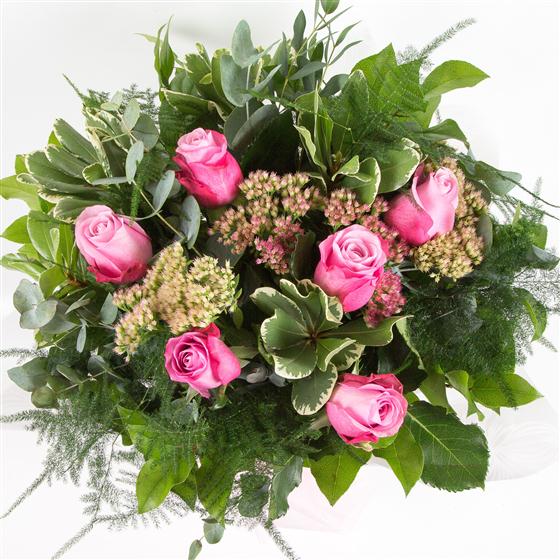 A hand-tied bouquet of six long stemmed pink roses encased in a selection of greenery. Deluxe is 9 roses.